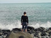 Playing with the timer as the tide goes up and wets our pants. |